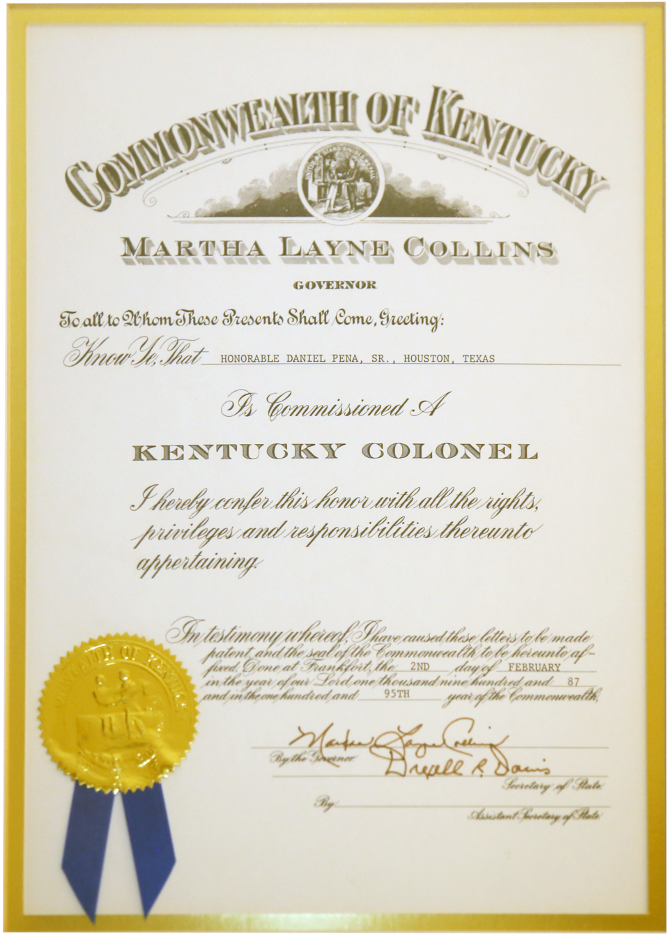 TIL that the title of "Kentucky Colonel" can be granted by the governor "for noteworthy accomplishments, contributions to civil society, remarkable deeds, or outstanding service to the community, state, or nation." Harland Sanders and Joe Gatto are famous examples of Kentucky Colonels.